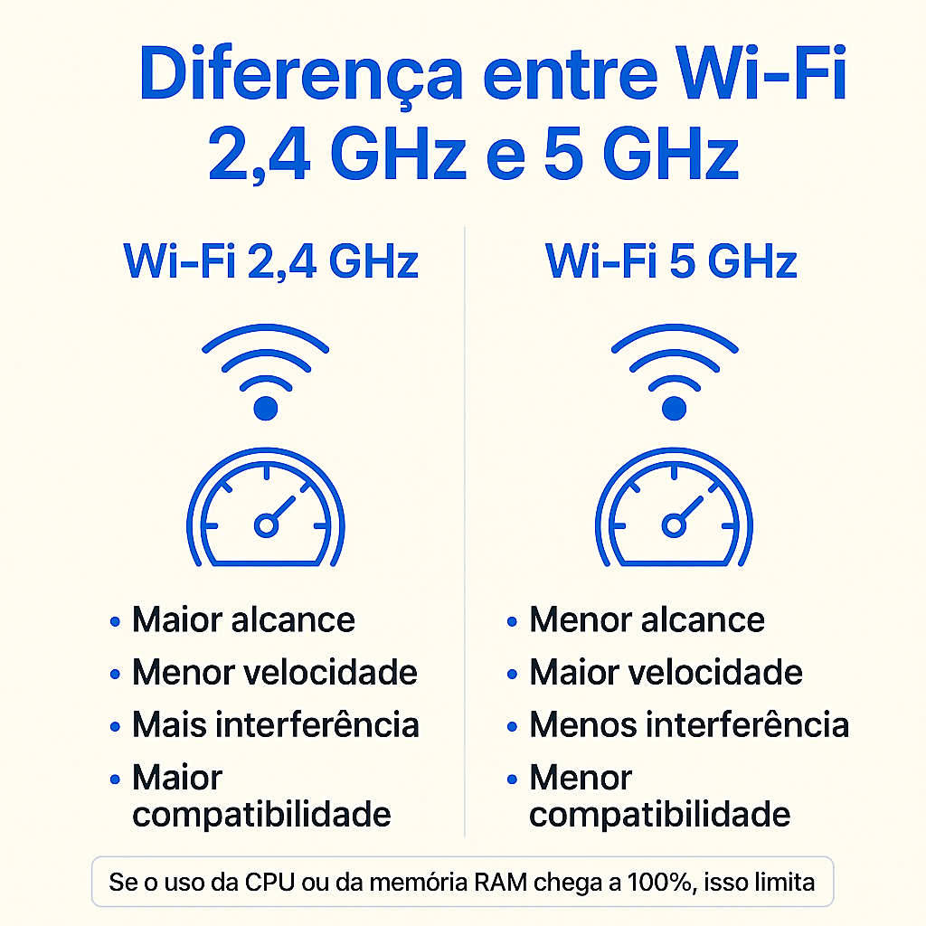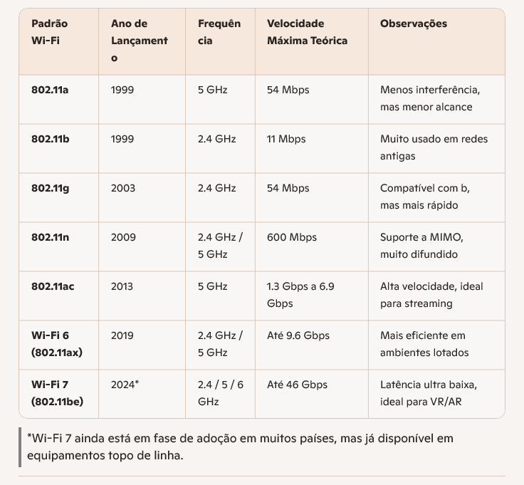 As redes Wi-Fi operam em faixas de frequência que determinam o alcance, velocidade e estabilidade da conexão. As mais comuns são: